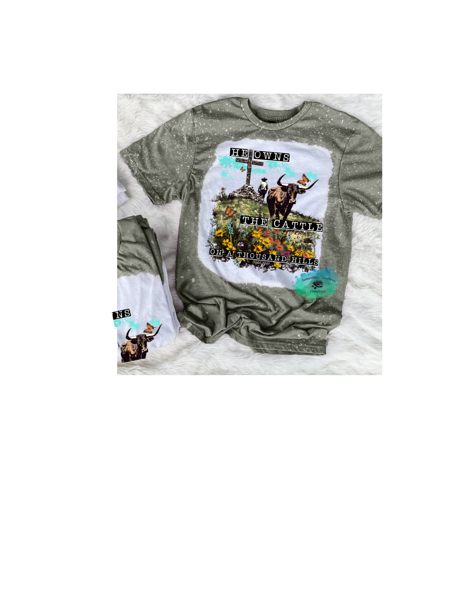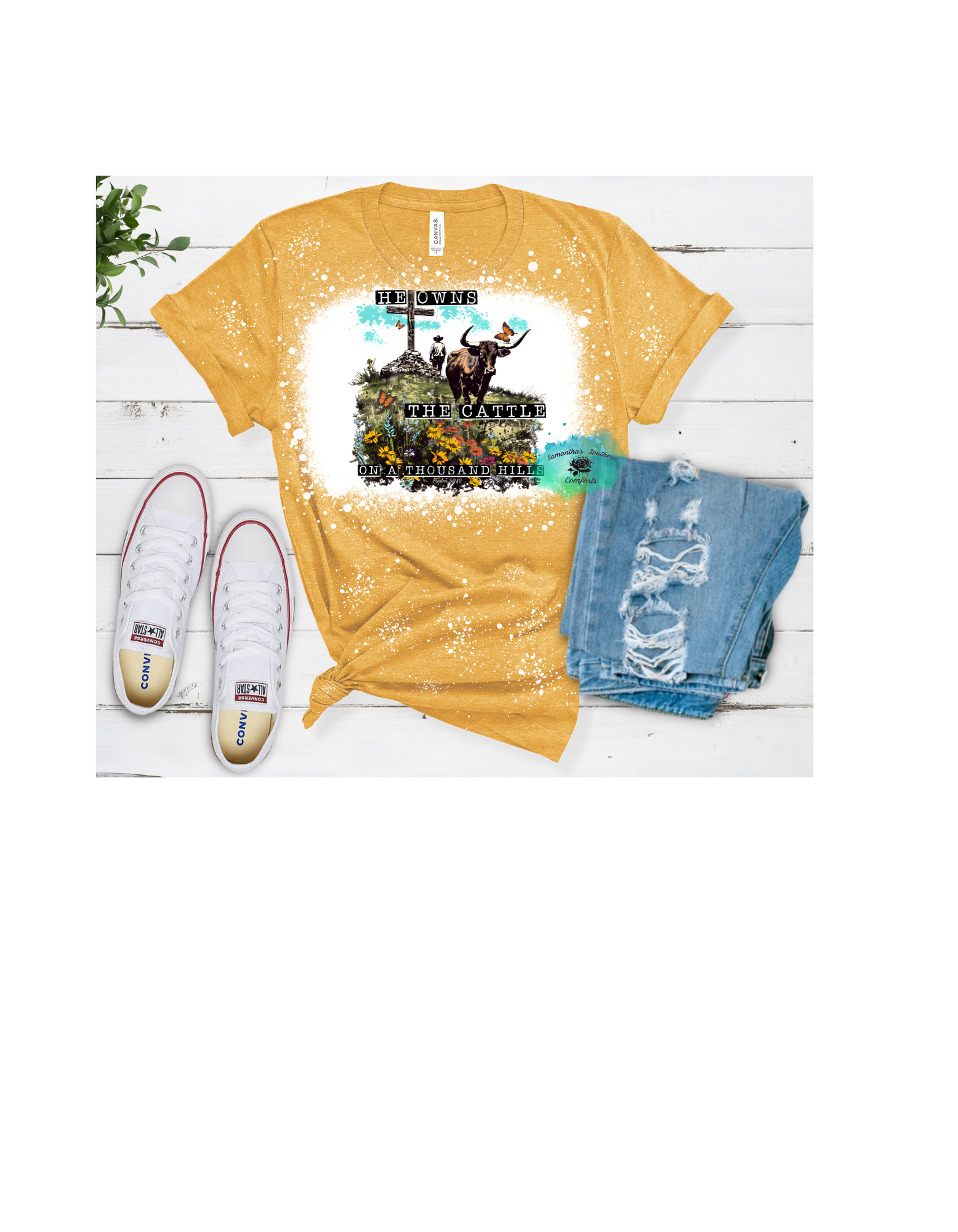 Bleached style tee. Poly Cotton Blend. Unisex Fit. Preshrunk. Available on Gildan softstyle heather military green or Bella Canvas heather gold yellow. Made to order. Bleached pattern will vary.